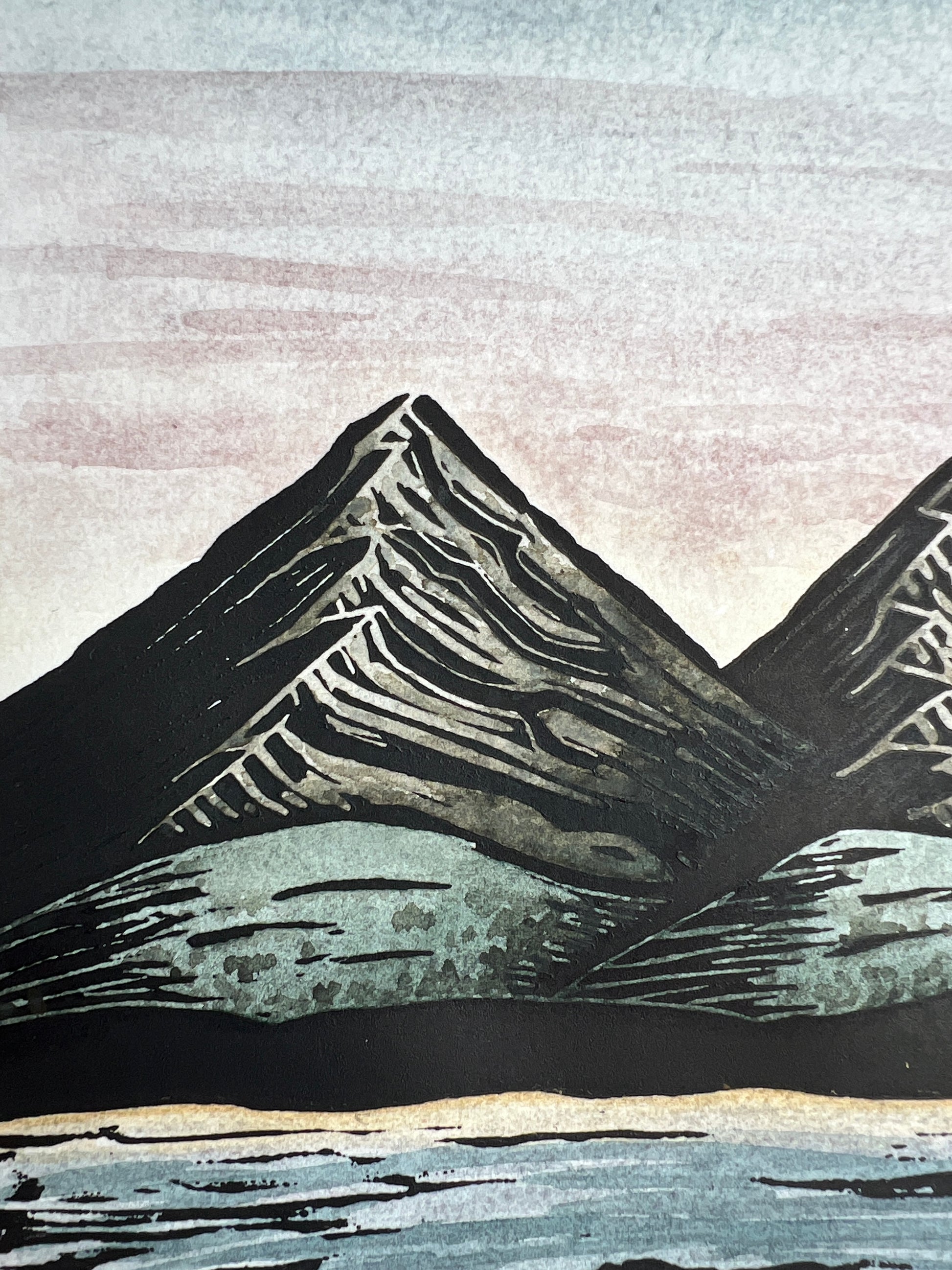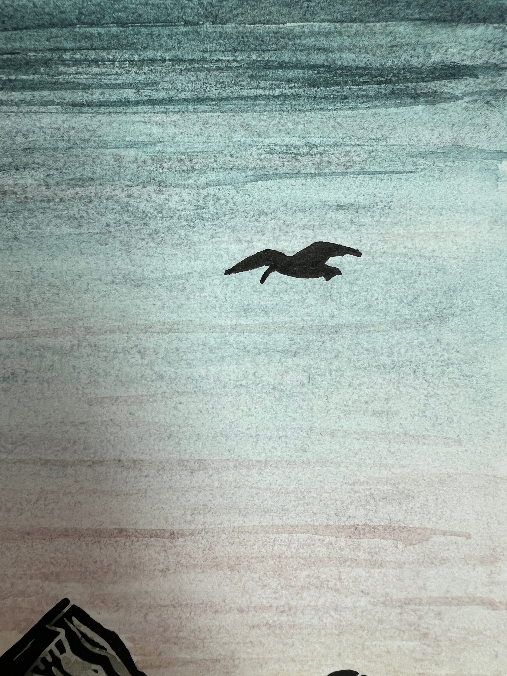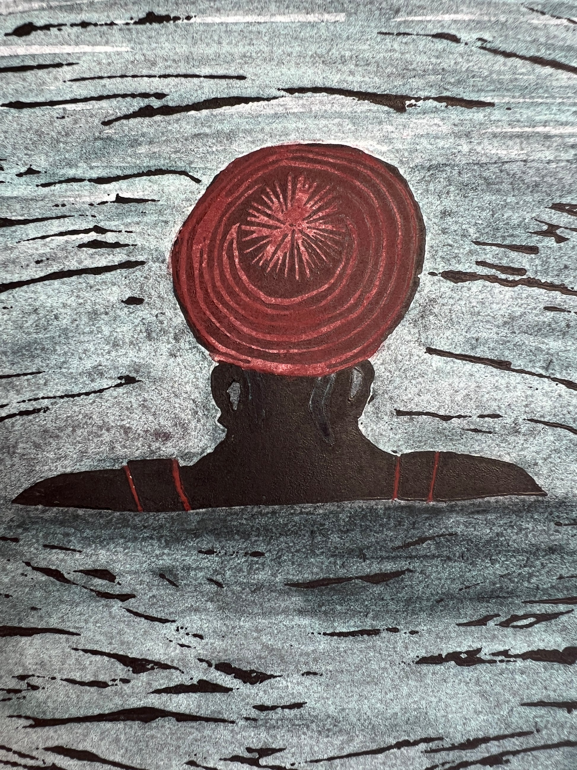 An original linoprint and watercolour inspired by sea swimming in Pittenweem and St Andrews In Scotland while curlews were calling overhead.